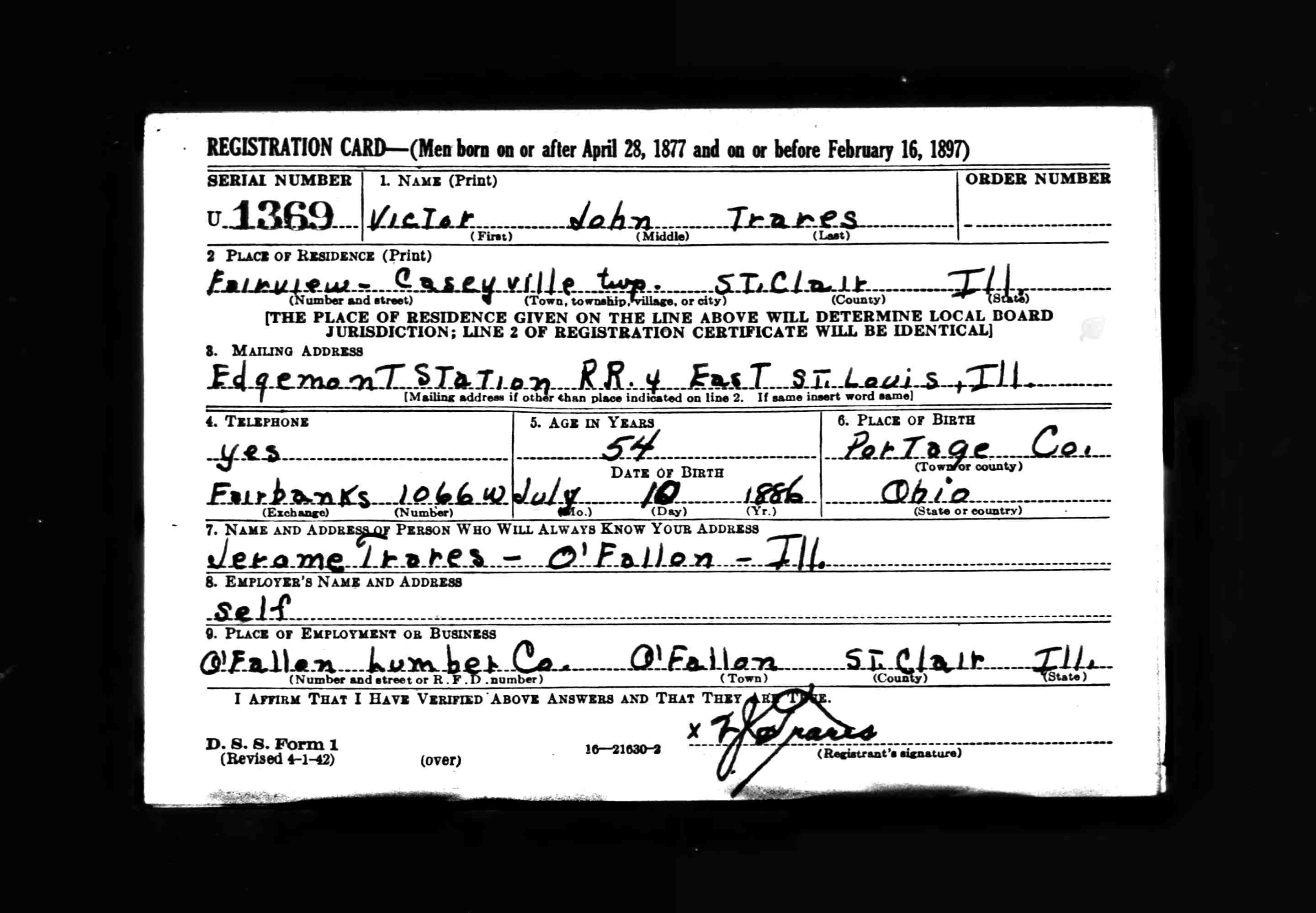 • Victor John TRARES: He was born 10 Jul 1886 in Suffield Twp., Portage Co., Ohio and died 12 Jan 1959 in Alton, Madison County, Illinois. On 14 Jan 1908, he married (1) Bertha Johanna Hildegard STOLZE in Illinois. Bertha was born 14 Jan 1885 in Edwardsville, Madison County, Illinois and died 2 Jan 1978 in Alton, Madison, Illinois. I believe they must have divorced, because Victor married (2) Carmen COURTNEY on 28 Nov 1935, location unknown.  Note: Edwardsville, IL should ring a bell because that is where John Sebastian TRARES moved to establish his pharmacy. [Read more about him in some of my older posts.] In doing some additional research, I located Victor’s WWII draft registration card, which lists a Jerome TRARES as a contact. Jerome TRARES is Victor’s son and died in 1995.You can view a larger image of his WWII draft registration card by clicking on the image below.