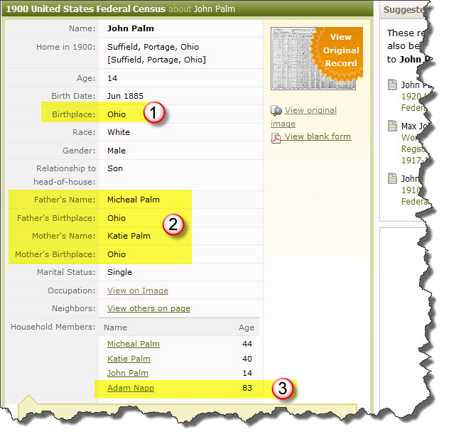 Searching on ancestry.com. this week, I looked at all John Palms in Portage County, Ohio that were born after 1880, because judging from his picture, he looked like a relatively young man, perhaps in his 20’s. Since I knew the picture was taken sometime in the early 1900’s, I guessed he was probably born sometime after 1880.