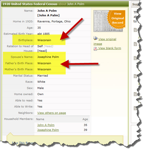 First of all, John Adam Palm was shown living in Ravenna with his wife, Josephine. Another telling piece of information was his birthplace – and that of his parents. This John Palm was born in Wisconsin, as were both of his parents. This also made it unlikely that he was the John Palm I was seeking.