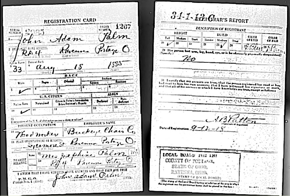 First, John Adam Palm listed an address on Sycamore Street in Ravenna as his address. His occupation was “wood worker” for Buckeye Chain.