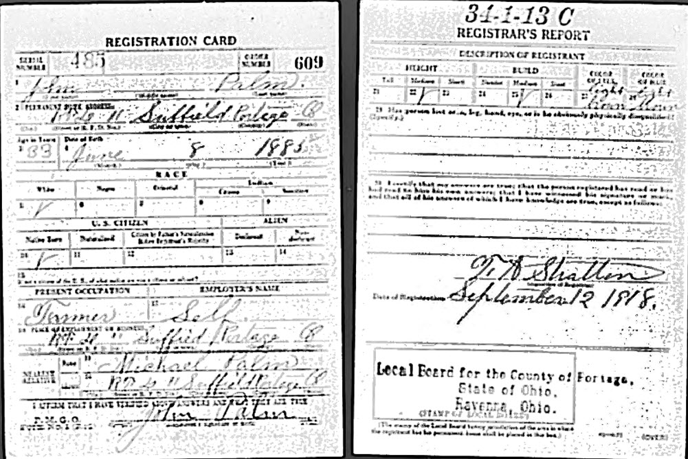 John Palm #2 lived in Suffield Township and listed his occupation as farmer. Plus he listed Michael Palm as the person most likely to always know his whereabouts. It didn’t list the relationship between Michael and John, but I suspect he was a close relative, probably a parent, brother or uncle.