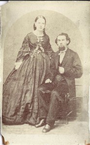 The man’s clothing is also typical 1860s. He wears a long coat over a vest and a bow tie. His boots are square-toed. He has a stylish 1860s beard. Mens’ styles did not change as quickly nor as dramatically as womens’ and 1880s mens’ clothing is not much changed.