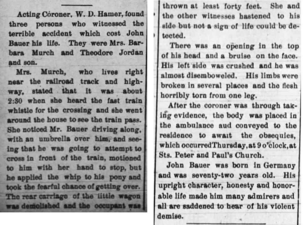 WARNING: The article is quite graphic as to the extent of John Bauer’s injuries, so be forewarned. This wasn’t uncommon in the newspapers of the era. The article provides a great deal of information about the accident and the Bauer family’s life during this time.